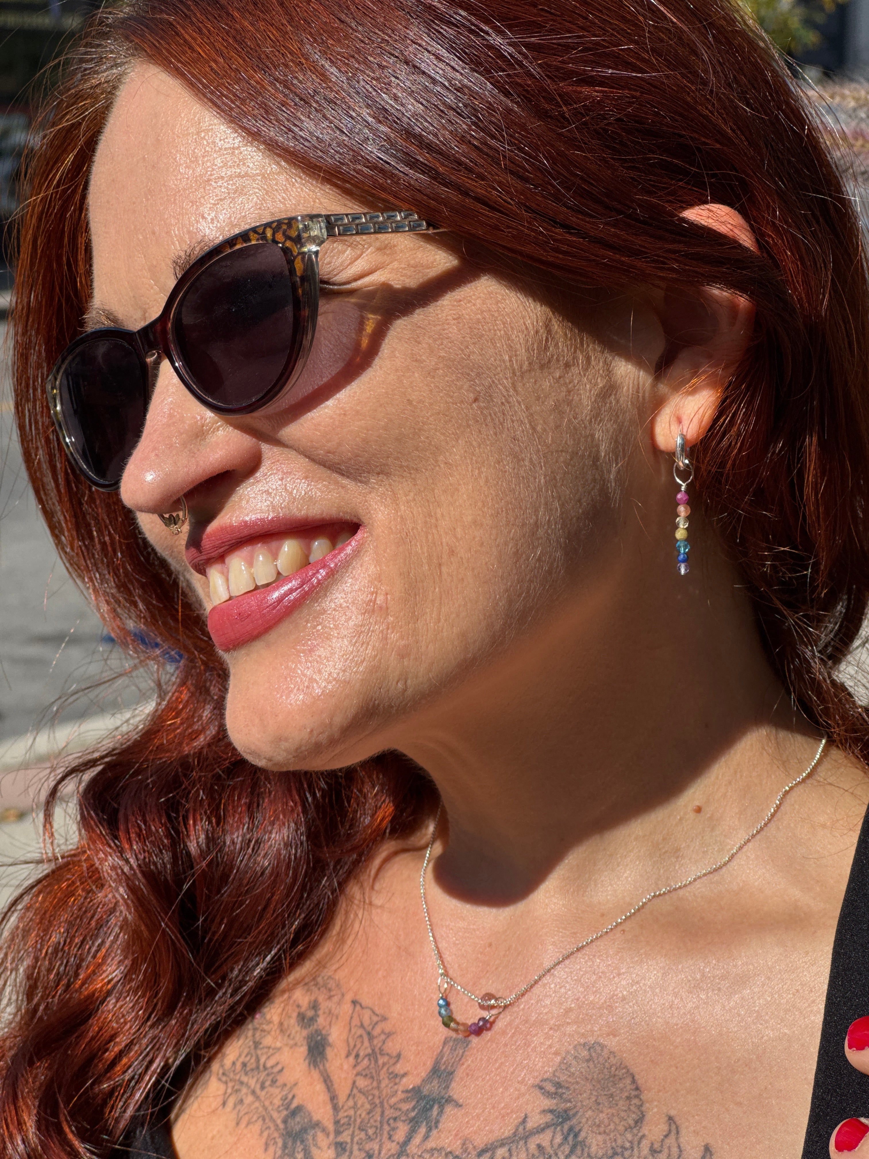 Our gemstone pride charm features 7 faceted gemstone beads in 7 colors of the rainbow: amethyst (purple), kyanite (navy), topaz (light bule), garnet (green), citrine (yellow), sunstone (orange), red (ruby).