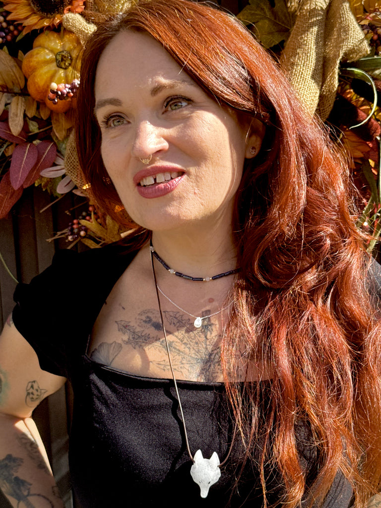 Freya - Snow Quartz Wolf Pendant on Greek Leather