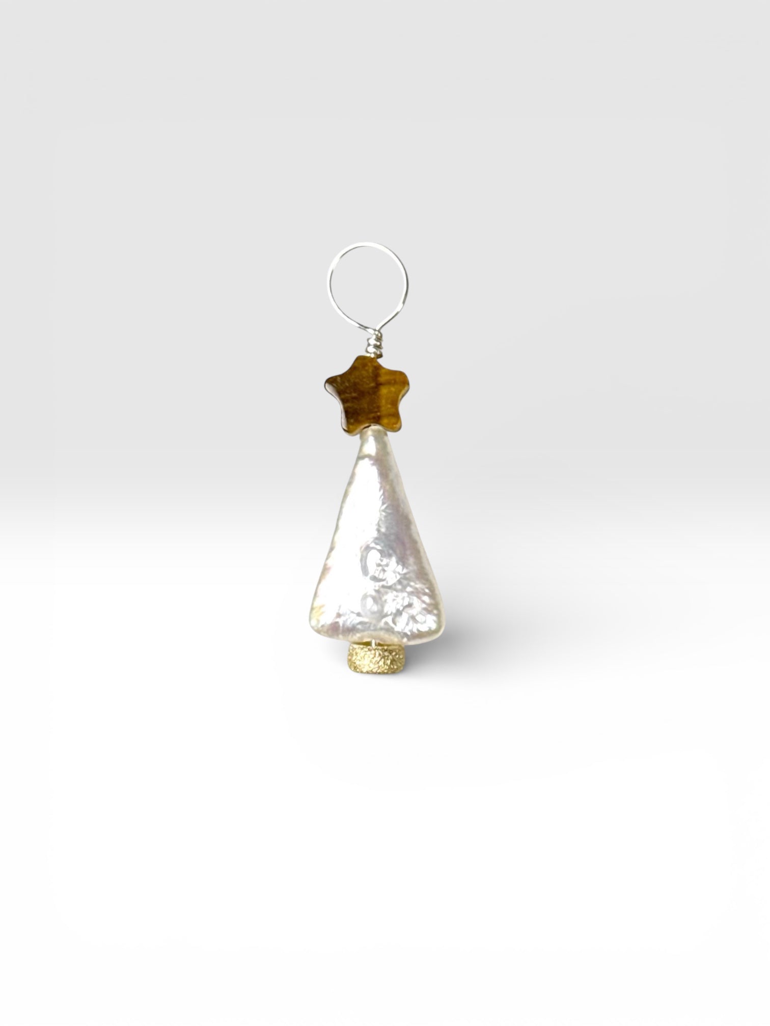 This is the pretties Christmas Tree there ever was! Made with a triangle freshwater pearl and a little tiger's eye star to top it off, this little charm will pair with both silver and gold pieces.